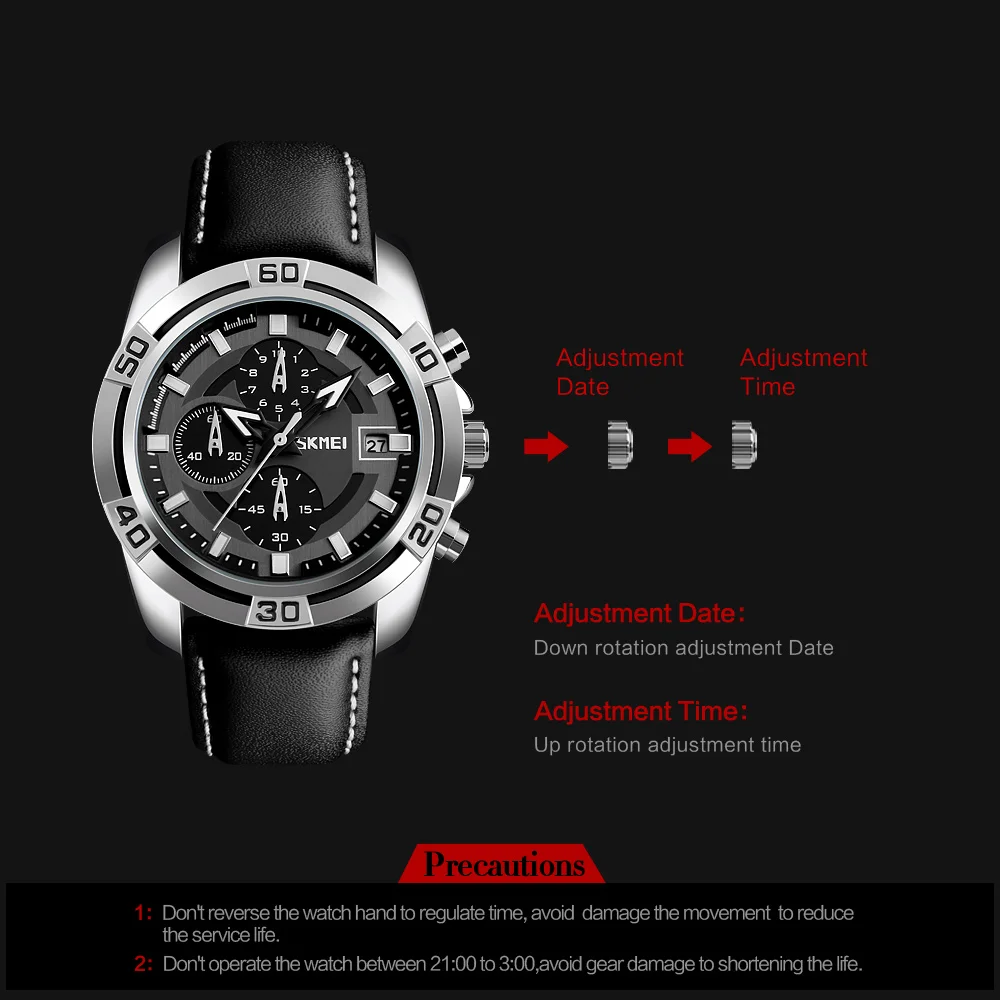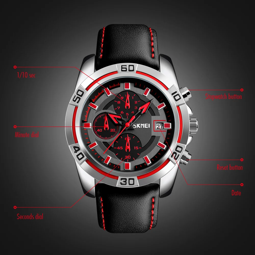 Increase quantity for SKMEI 9156 Mens Watch, Chronograph Date Wristwatch Men, Waterproof Soft Black Leather Strap Military Watch Red